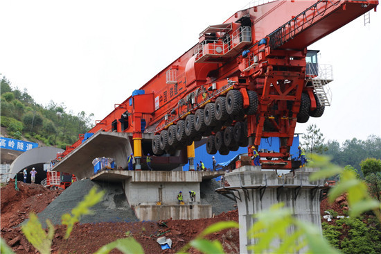 The dead weight of special launching carrier is 672 tons. As the advanced special heavy lifting equipment, it can combine the functions of box girder lifting, box girder transportation and box girder erection. Fast working and flexible working are the advantages of the equipment. Besides, the special launching carrier can also erect box girder with a distance of Zero to the exit of tunnels.